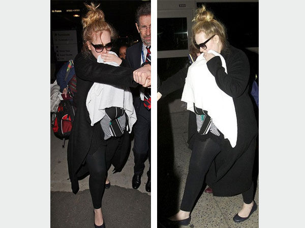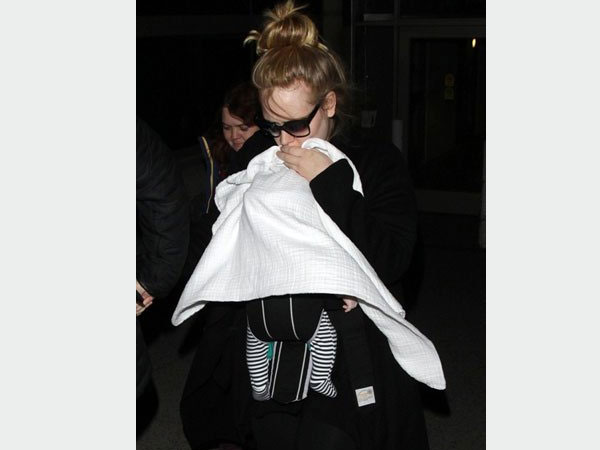 أديل نجحت في إخفاء مولودها كلياً من أضواء الكاميرات التي لاحقته عند ظهوره مع المطربة في ولاية لوس أنجلوس الأمريكية، حيث غطت أديل مولودها الذي لم يتجاوز الثلاثة أشهر بغطاء رأس أبيض لتتمكن من إخفاءه.